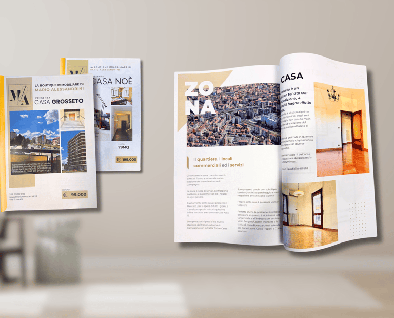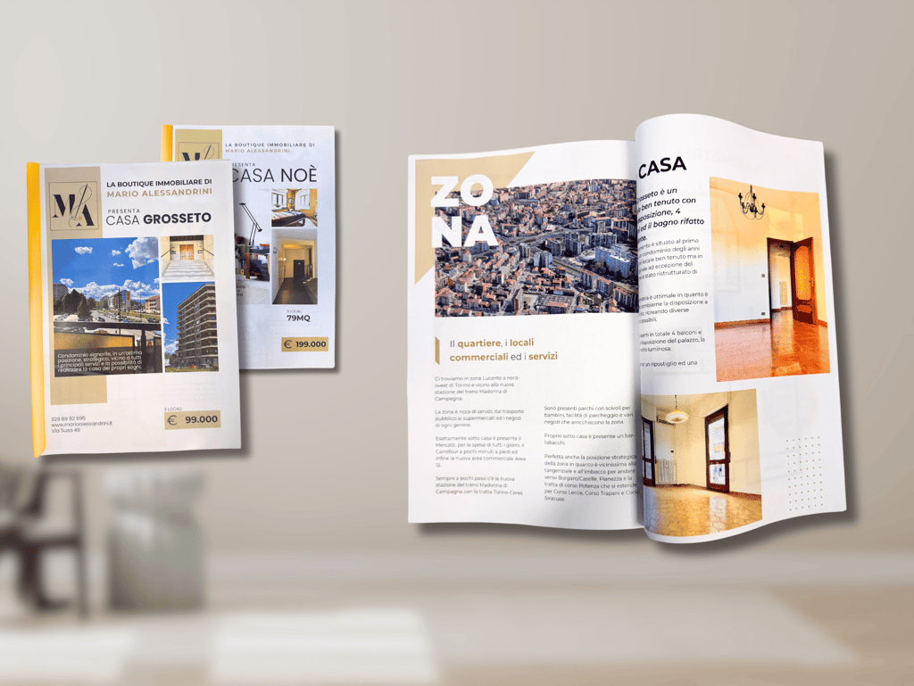 Per valorizzare al meglio l’immobile non ci limitiamo alla semplice brochure, ma realizziamo una vera e propria rivista stampata su carta di qualità, con un aspetto unico e deciso.